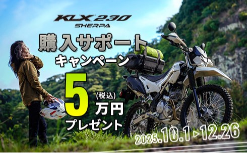 対象期間中にお申し込みフォームよりキャンペーンにお申し込み頂き、「KLX230 SHERPA(2025年モデル)」の新車をご購入いただいたお客様に、購入時のお支払い金額の一部としてご利用いただける、5万円分のクーポンをプレゼントいたします。 <キャンペーン期間>2025年10月1日(水)〜2025年12月26日(金) <対象モデル>KLX230 SHERPA (2025年モデル)